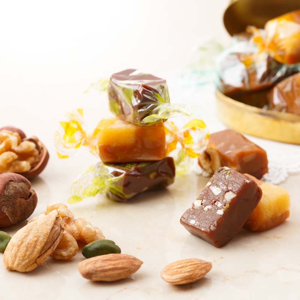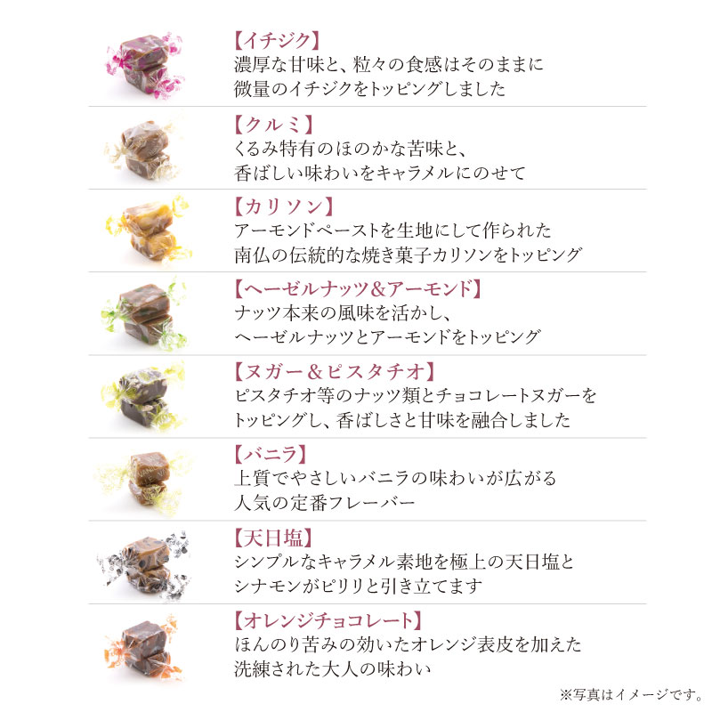 ※フレーバーにより、キャラメル表面にメレンゲなどの白い粉末や花びら等が浮き出ている場合がございます。ナッツ・花・果物類のトッピングは手作りのため、量・色の濃淡・位置に違いがございますが品質に問題はございませんので安心してお召し上がりください。
