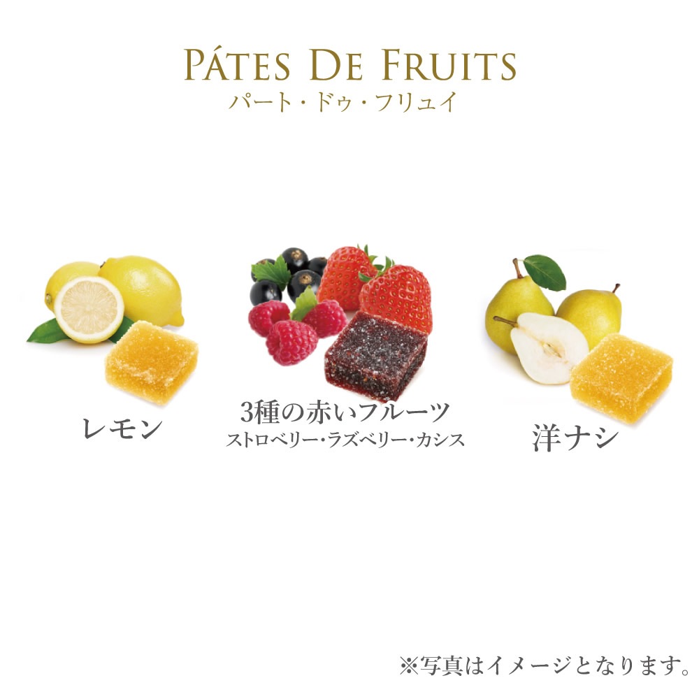 ※パート・ドゥ・フリュイ(ゼリー)の表面を覆う白く小さな粒は、ゼリーの風味やみずみずしさを長持ちさせる転化糖(砂糖の一種)です。転化糖は低温で溶ける特性がありますので、冷蔵庫には入れず、高温多湿を避け、常温で保存し、できるだけお早目にお召し上がりください。