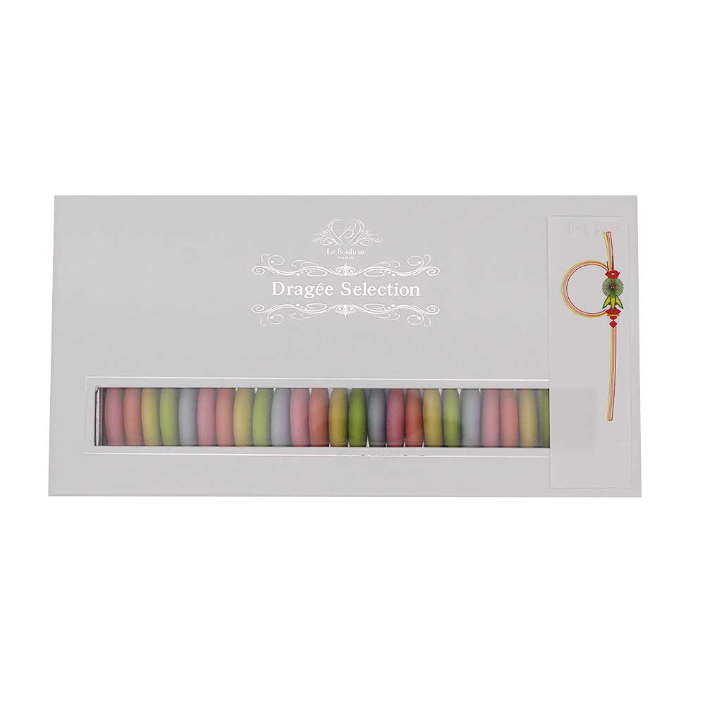 ホワイト(マット)には子孫繁栄の象徴としてイタリア・シチリア産のアーモンドを使用。パステルカラーやシルバーなどのカラフルなお色には甘さを抑えたチョコレートが入っています。珈琲や紅茶など、ティータイムのお供にもぴったりなフランス産ドラジェをお楽しみください。
