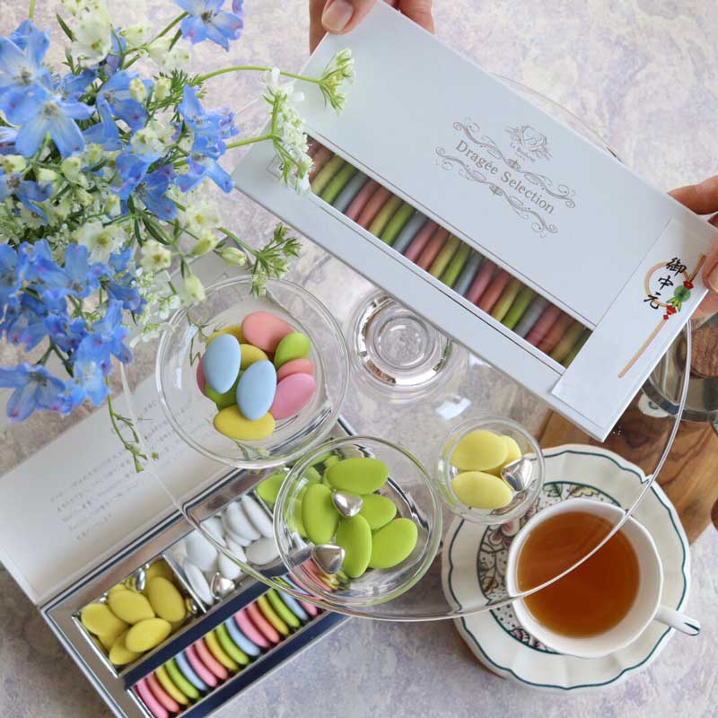 ヨーロッパでは紀元前170 年代後半より貴族の間で婚礼や出産などの慶事に祝い菓子として使用されておりフランス語で「幸福の種」という意味もあるドラジェ。Health(健康) Prosperity(繁栄) Wealth(富) Happiness(幸福) Longevity(長寿) 5つの願いを込めて“しあわせ” と “ありがとう” を運ぶお菓子を大切なあなたにお届けいたします。
