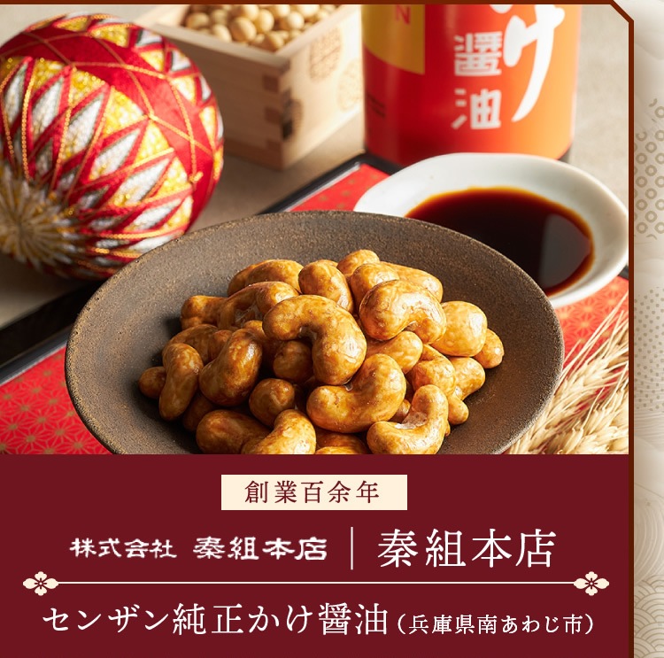創業百余年の老舗醸造所の技が凝縮された、天然醸造醤油を衣焼カシュ―ナッツに絡めてつくりました。