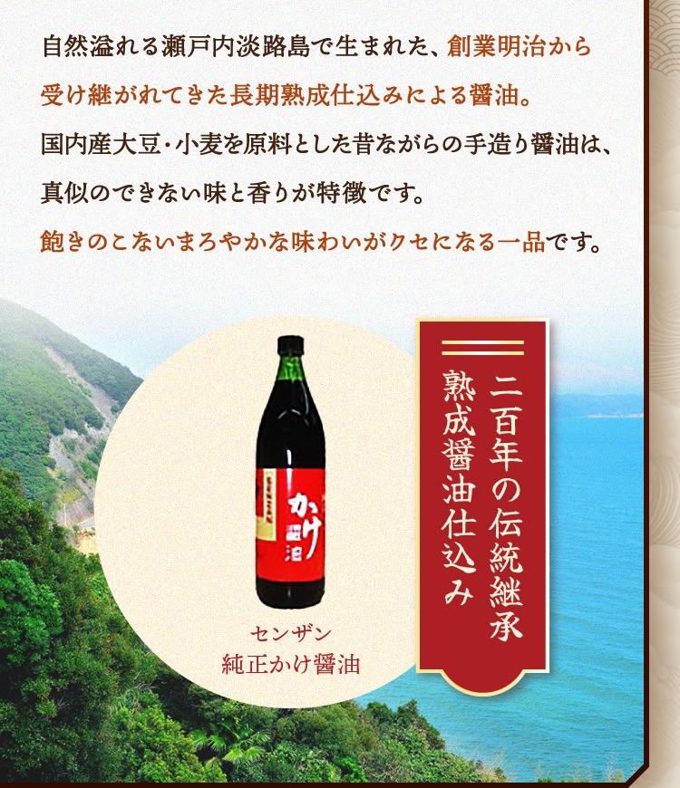 創業明治から受け継がれてきた長期熟成仕込みによるセンザン醤油使用。