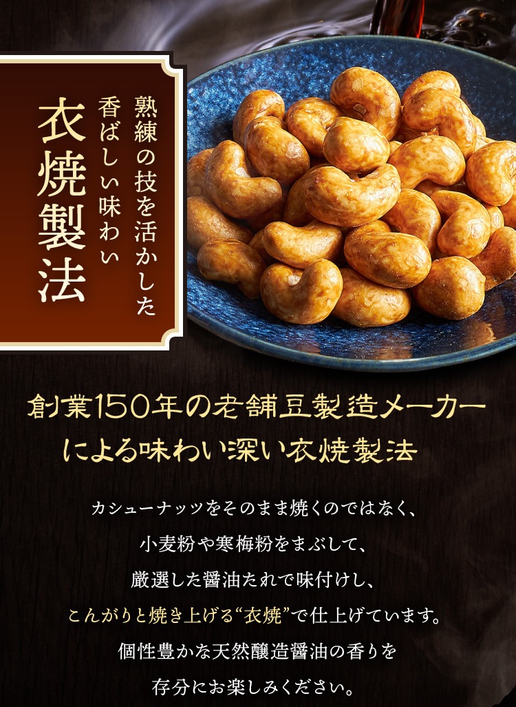 創業百余年の老舗醸造所の技が凝縮された、天然醸造醤油を衣焼カシュ―ナッツに絡めてつくりました。