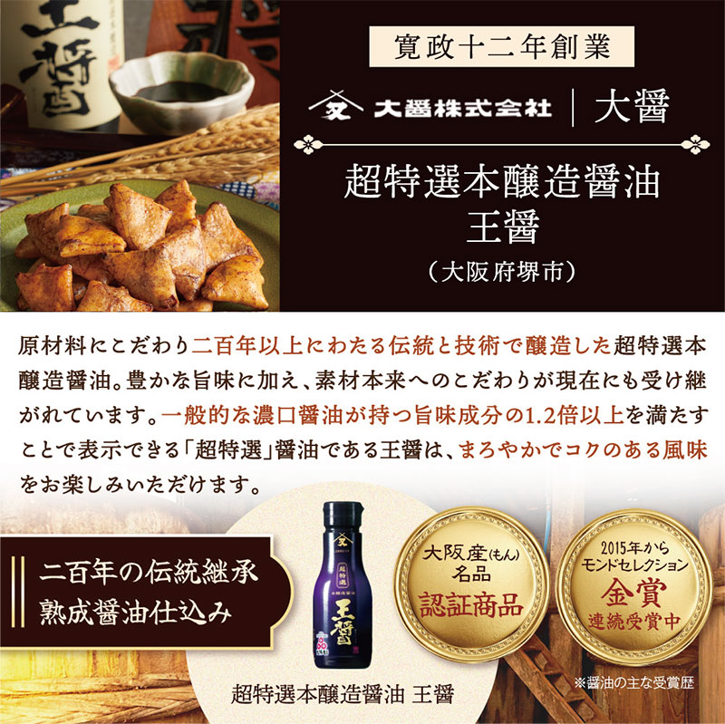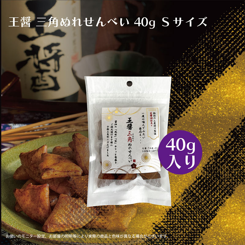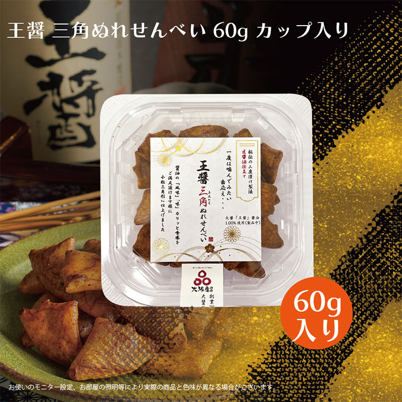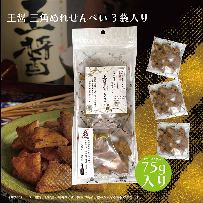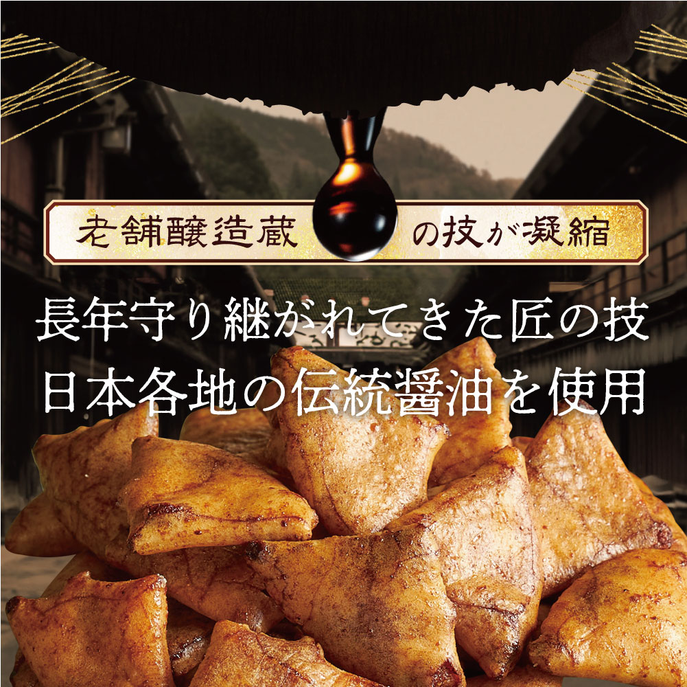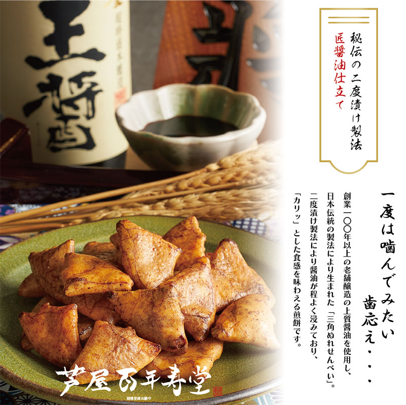 創業100年以上の老舗醸造の上質醤油を使用し、日本伝統の製法により生まれた「三角ぬれせんべい」。2度漬け製法により醤油が程よく浸みており、「カリッ」とした食感を味わえる煎餅です。