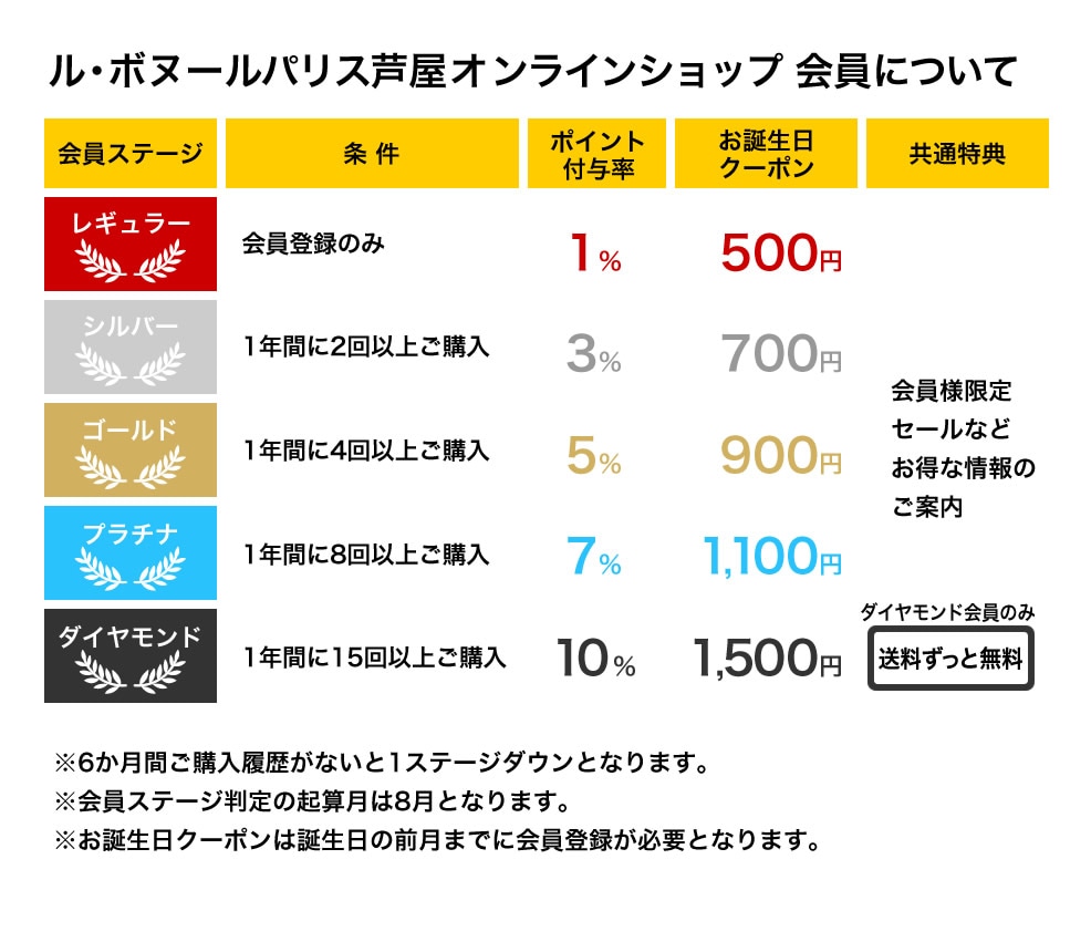 会員登録をいただいたお客様を対象にお買い上げ金額にあわせてポイントを付与させていただきます。また会員様のお買い上げ回数によりポイント付与率や特典がお得になる会員ステージも設定させていただくこととなりました。詳しくは下記のチャートをご参照くださいませ。