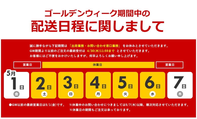 配送休み前出荷分の受付は 2025年5月1日(木)AM11:59 までに